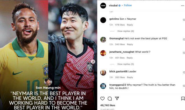 일부 팬들은 "손흥민이 네이마르보다 훨씬 뛰어난 선수다"라고 하거나 "왜 네이마르가 세계 최고의 선수라 말하는 거야? 진실은 당신(손흥민)이 네이마르보다 뛰어나다. 의심할 필요 없어"라고 주장했다.