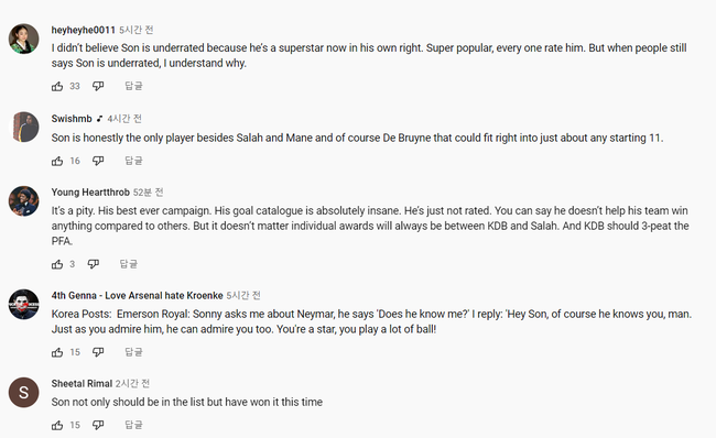 또 다른 팬은 “손흥민과 베스트11을 뽑을 때 경쟁할 수 있는 선수는 솔직히 살라, 마네, 데 브라위너 밖에 없다”고 동의했다.