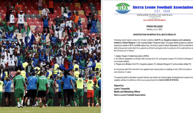 영국 '스포츠 바이블'은 7일(한국시간) "시에라리온 2부 리그에서 역대급 승부 조작이 펼쳐졌다. 2경기에서 각각 스코어가 95-0, 91-1로 경기가 마무리됐다"고 보도했다.
