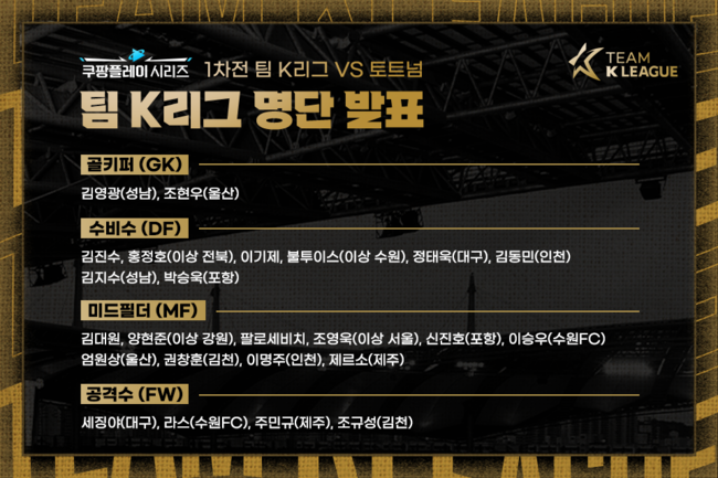 한국프로축구연맹이 '쿠팡플레이 시리즈' 1차전 토트넘 홋스퍼와 맞대결에 나서는 팀 K리그 선수 명단을 7일(목) 발표했다.
