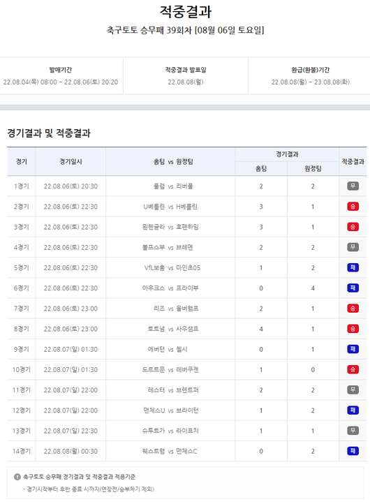 EPL 및 분데스리가 14경기 대상 축구토토 승무패 39회차 적중결과