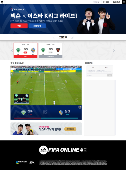 8일 넥슨은 ‘피파 온라인4’가 게임사로는 국내 최초로 스포츠 중계권을 확보하고, 프로축구 K리그 공식 경기를 홈페이지에 중계한다고 밝혔다. 중계는 축구 예능 유튜브 채널 ‘이스타TV’에서 활약 중인 해설가 이주헌과 박종윤을 통해 진행된다. 이들 해설진은 K리그에 대한 남다른 애정과 축구에 대한 높은 이해도, 뛰어난 상황 파악, 재치 있는 입담으로 국내 축구 팬들에게 큰 인기를 얻고 있다.