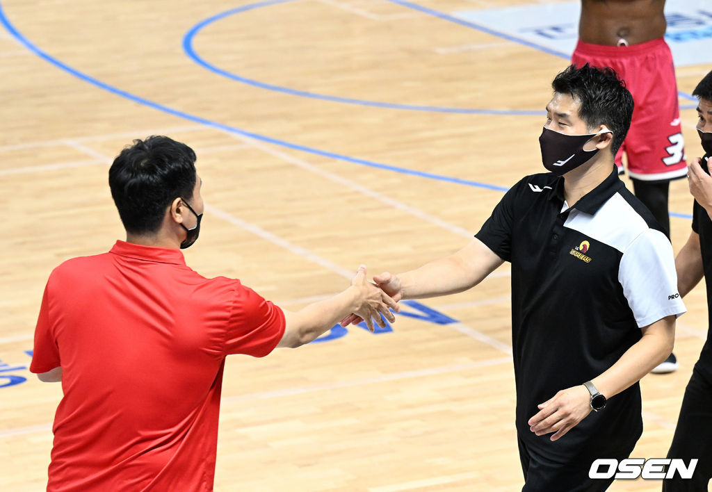 휘슬이 울리자 LG 조상현 감독은 미소를 지으며 동생 조동현 감독에게 축하를 건넸다.