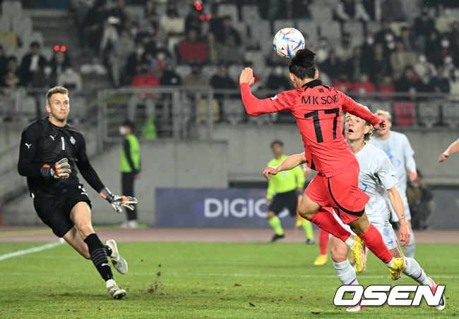 첫 골은 송민규의 머리에서 터졌다. 전반 32분 조규성이 개인기로 수비수를 제친 뒤 왼발로 크로스를 올렸다. 송민규도 쇄도하며 머리로 밀어넣어 첫 골을 뽑았다. 한국이 1-0 리드를 잡았다.