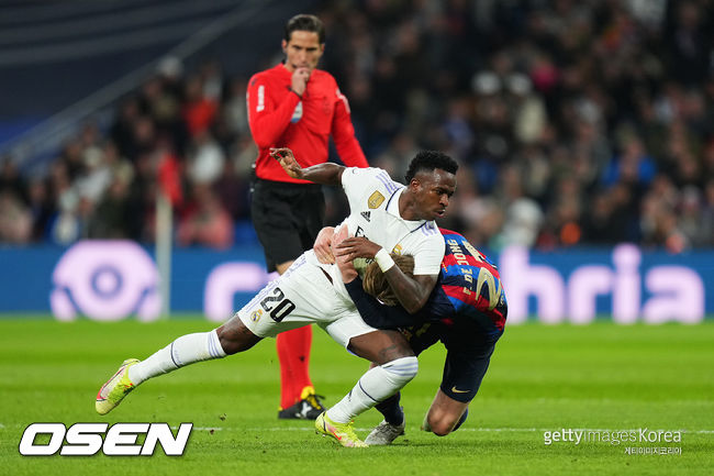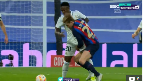 0-0이던 전반 23분 레알의 비니시우스는 바르사의 프랭키 데 용과 몸싸움 과정에서 거친 플레이로 옐로 카드를 받았다.
