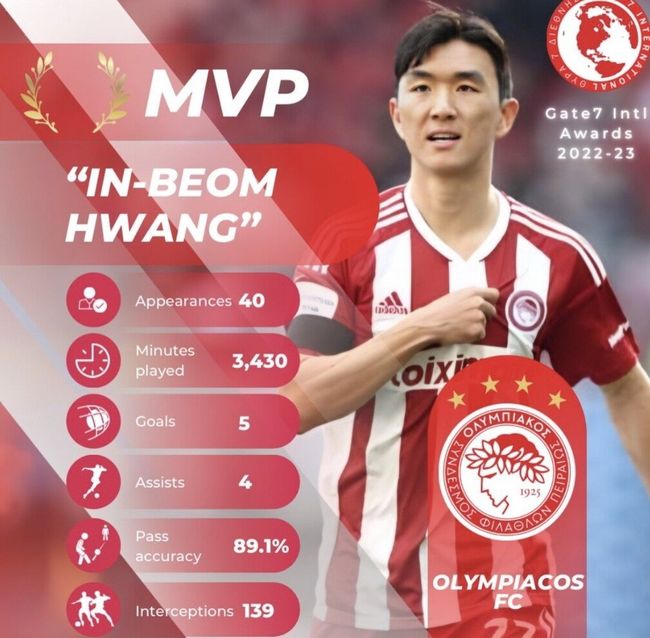 올림피아코스 전문 매체 그리스 '게이트 7 인터내셔널'은 6일(한국시간) 팬투표로 선정한 2022-2023 시즌 올림피아코스 MVP로 황인범을 선정했다.