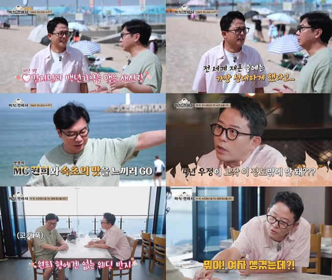 여행 중 들른 매장에서는 김준호·김지민 부부를 위한 결혼 축하 서비스도 이어져 눈길을 끈다. 식사 메뉴를 살펴 보던 김준호는 “이건 지민이가 좋아하는 거, 이런 누룽지도 지민이가 좋아한다. 결혼하니 아내가 좋아하는 것만 보인다”며 ‘사랑꾼’ 면모를 숨기지 않는다. 이에 임원희가 “손에 반지가 두 개 있네?”라고 묻자, 김준호는 “하나는 연애 때 끼던 반지, 하나는 형에게 없는(?) 반지”라고 농담을 던진다. 반대로 김준호가 “형 손목에 못 보던 팔찌가 있네? 여자친구 생긴 거 아니야?”고 의혹을 제기하자, 임원희는 “카메라 감독님 따님이 준 것”이라며 진땀을 흘린다.