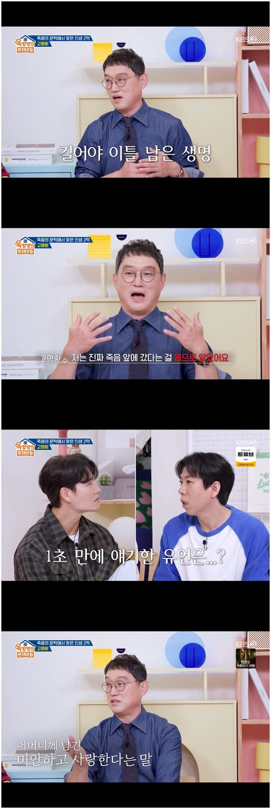 이틀의 고비를 넘겨야 생사를 알 수 있는 상황이었다. 그는 “병원에서 할 수 있는 건 다했다고 하더라. 남은 건 자생뿐이더라. 그런데 그런 사례가 거의 없었다더라. 그래서 유언하고 중환자실 가서 죽는 순간만 기다리고 있었다”라고 말해 모두를 놀라게 했다.
