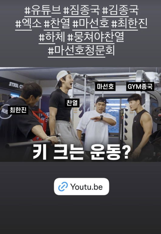 김종국은 22일 자신의 인스타그램 스토리에 ‘짐종국’, ‘찬열’, ‘마선호’, ‘최한진’, ‘하체’ 등 해시태그와 함께 사진 한 장을 게재했다.