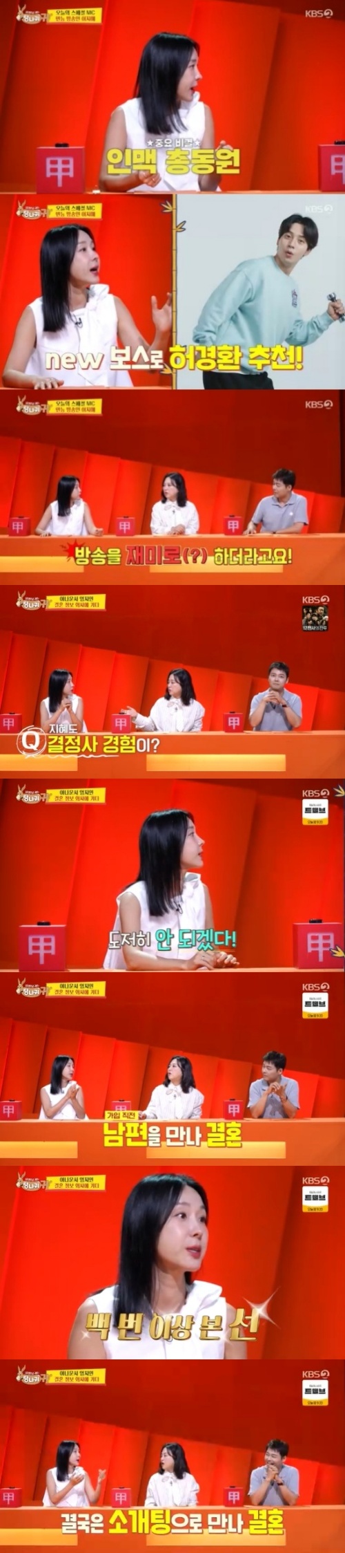 이지혜는 "나도 결혼 전 도저히 안되겠다 싶어서 결정사에 가입하려고 했는데 때마침 우리 남편을 만났다"며 "근데 우리 남편이 결정사 3군데 넘게 가입해서 100번 넘게 선을 봤다. 그때 전부 실패하고 나와 소개팅을 했는데 바로 결혼했다. 남편이 결정사 VIP였다. 돈을 여기저기 많이 뿌리고 다녔다"고 털어놨다. 이에 김숙과 이순실은 "역시 인연은 따로 있다"고 덧붙였다.