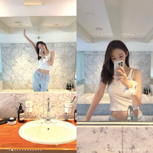 공개된 사진에는 호텔 못지 않는 게스트하우스 내부가 담겨있었고, 넓은 화장실에서 강민경은 잠옷 차림으로 거울 셀카를 찍고 있다.