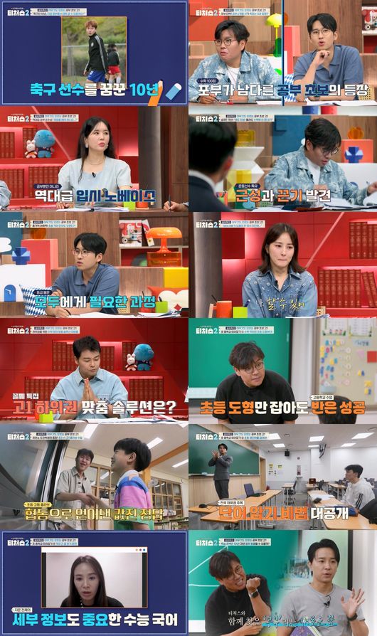 24일 방송된 ‘티처스2’에는 ‘축구 유망주’였지만 부상으로 인해 ‘축구 선수’의 꿈을 접고 공부를 시작한 ‘공부 초보’ 고1 도전학생이 찾아왔다. 도전학생은 “뒤늦게 공부 시작한지 6개월 됐는데 어떻게 해야 할지 모르겠다. 평생 축구밖에 몰랐던 제가 3년 안에 다른 친구들을 따라잡을 수 있을까요?”라며 도움을 구했다. 도전학생은 뒤늦게 입시 전선에 들어온 만큼 수시전형, 세특(세부사항 및 특기활동), 모고(모의고사) 등 용어 자체도 모르는 게 많았다. 도전학생의 부모님 또한 문제집 고르는 것부터 난항을 겪고 있었고, 원점수, 표준점수, 등급 등이 있는 성적표도 어떻게 보는지 어려워했다. ‘입시 전략 멘토’ 미미미누는 족집게 강의로 성적표 분석법을 전해 부모님의 이해를 도왔다.