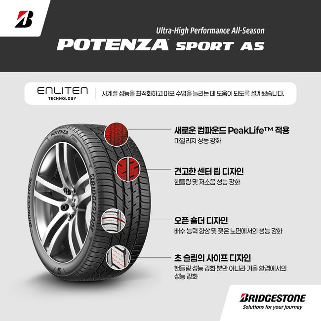 브리지스톤의 국내법인 브리지스톤 타이어 세일즈 코리아(대표이사 김헌영, 이하 브리지스톤)는 25일 ‘포텐자 스포츠 AS(Potenza Sport AS, AS는 ‘All Season’의 약자)’의 국내 출시를 알리며 "국내의 사계절 날씨에 구애받지 않고 강력한 스포츠 주행 성능을 원하는 운전자들을 위한 새로운 선택이 될 것이다"고 밝혔다.