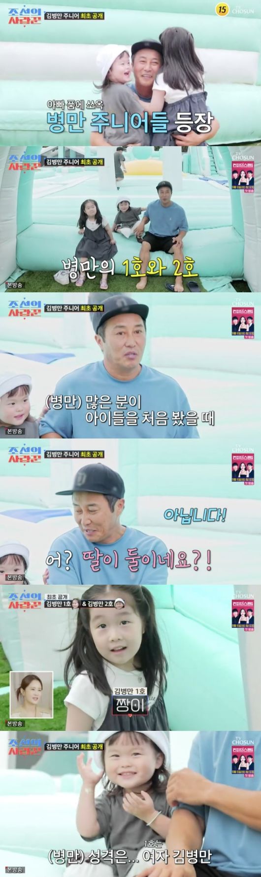 김병만은 “1호, 2호다. 아이들을 처음 봤을 때 딸이 둘이네요, 한다. 성격은 여자 김병만, 남자 김병만이다”라고 말한 후 “첫째가 몸은 아내를 닮았다. 키가 클 것 같다. 먹는 걸 좋아한다. 전체적으로 크다. 애를 안고 혼자 산책을 가면 큰 애를 안고 다닌다고 생각한다”라고 덧붙였다.