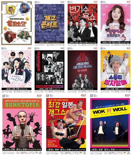 개막까지 사흘 앞둔 ‘제13회 부산국제코미디페스티벌’(이하 ‘부코페’)은 오는 8월 29일(금)부터 9월 7일(일)까지 열흘간 부산 전역에서 개최된다. 화려한 극장 라인업을 완성한 ‘부코페’는 아시아 최대 코미디 페스티벌의 명성에 걸맞은 수준 높은 공연을 관객들에게 선보이며, 축제의 질을 높인다. 대한민국 개그계를 이끌어온 스타 개그맨들과 신선한 크리에이터, 그리고 세계 각국의 유쾌한 코미디 아티스트들이 총출동해 한층 다채롭고 풍성한 무대로 관객들을 맞이할 예정이다.