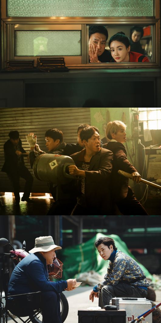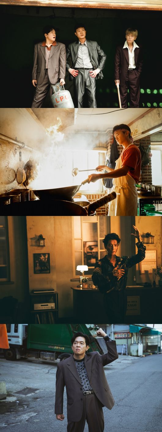 공개된 보도스틸은 배우들의 빛나는 케미스트리와 함께 각 캐릭터들의 개성 넘치는 매력을 한눈에 확인할 수 있어 눈길을 사로잡는다. 먼저 ‘식구파’ 3인방의 과거부터 현재까지를 엿볼 수 있는 스틸에서 서로의 등을 맞댄 채 ‘순태’(조우진)는 목장갑을, ‘강표’(정경호)는 목검을, ‘판호’(박지환)가 가스통을 이용해 상대 조직원들과 사투를 벌이는 모습은 세 사람의 서로 다른 액션 스타일과 다채로운 매력을 엿볼 수 있어 기대감이 증폭된다.