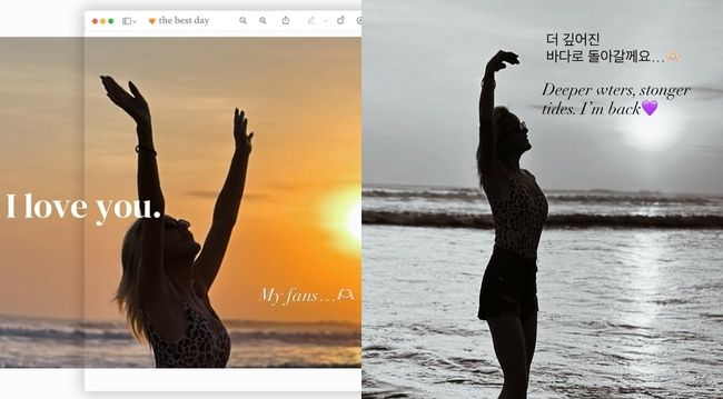 공개된 사진에는 해변가에서 노을을 배경으로 환한 미소를 짓고 있는 바다의 모습이 담겼다. 바다는 "더 깊어진 바다로 돌아갈게요..♥"라는 말을 덧붙여 팬들을 향한 감사 인사를 전했다.
