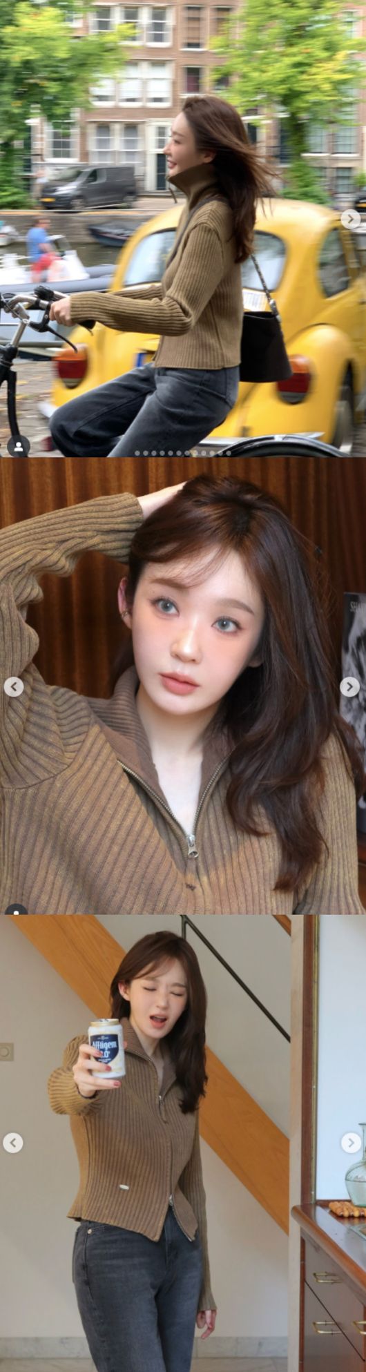 공개된 사진 속 강민경은 네덜란드 암스테르담에서 자전거를 타고 신나게 달려가는 모습이 담겼다. 이어 그는 컬러렌즈를 낀 얼굴로 다양한 포즈를 취하기도 했다.