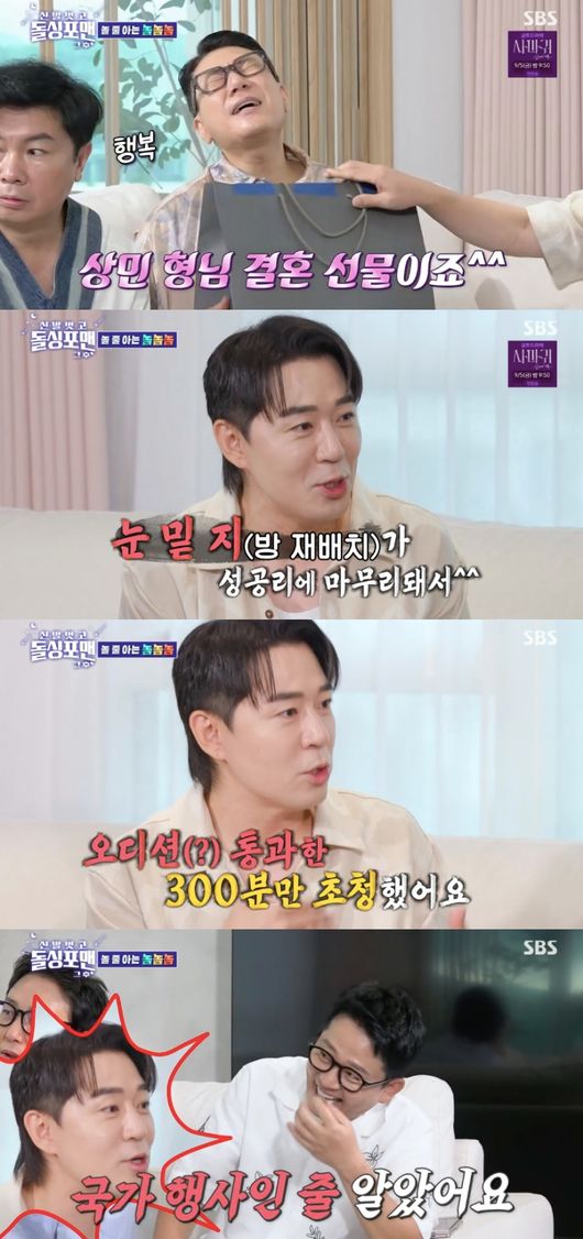 이날 이상민은 선물 들고 온 붐에 “시작부터 혼란스럽다. 누구의 결혼을 축하하는 건지?”라며 기대했다. 붐은 “과한 건 아니고 오다 주웠다. 예전에 도움 받은 것도 많고 해서”라며 이상민에게 선물을 건넸다.