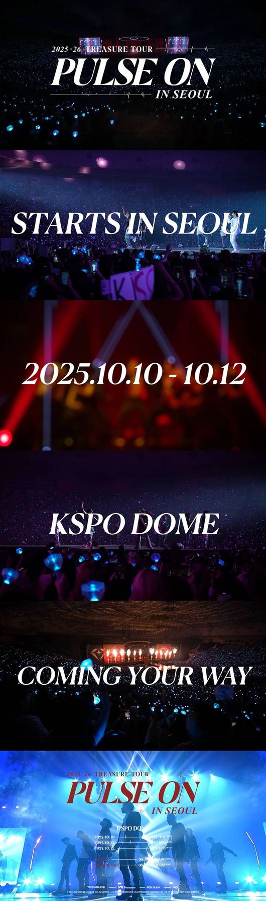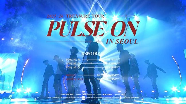 트레저는 오는 10월 10일부터 12일까지 사흘간 서울 송파구 방이동 KSPO DOME에서 '2025-26 TREASURE TOUR [PULSE ON] IN SEOUL'을 개최한다. 'K팝의 성지'라 불리는 해당 공연장에 네 번째 입성하게 되는 것으로, 미니 3집 [LOVE PULSE] 발매 이후 첫 콘서트라 큰 관심이 쏠린다.