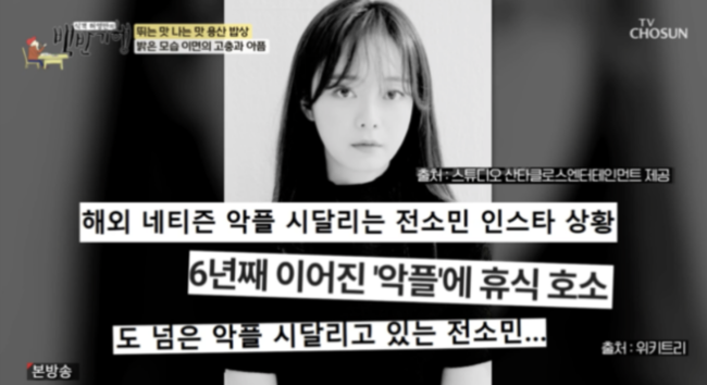 한 악플러는 "전소민은 매일 ‘런닝맨’에 있다. 온 가족이 저주를 받는다. 전소민을 ‘런닝맨’에서 퇴장시키거나 가족이 매일 저주를 받도록 해라:라며 도 넘은 악성 메시지를 여러 차례 보낸 걸로 알려졌다. 전소민이 악성 댓글을 단 악플러에 대해 SNS ‘박제’로 응수하기도.