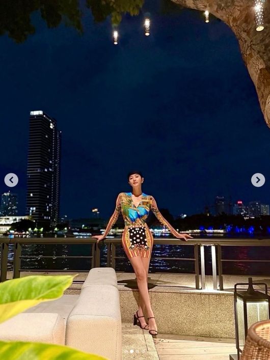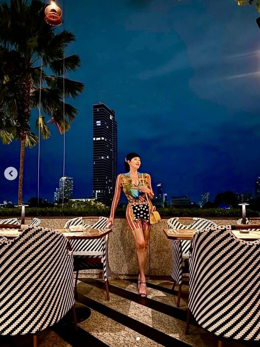 공개된 사진에는 고급 호텔로 보이는 곳에서 화려한 야경을 즐기고 있는 김혜수의 모습이 담겨 있었다. 김혜수는 두건을 쓰고 몸매를 그대로 드러낸 화려한 패턴의 의상을 입고 있었다.