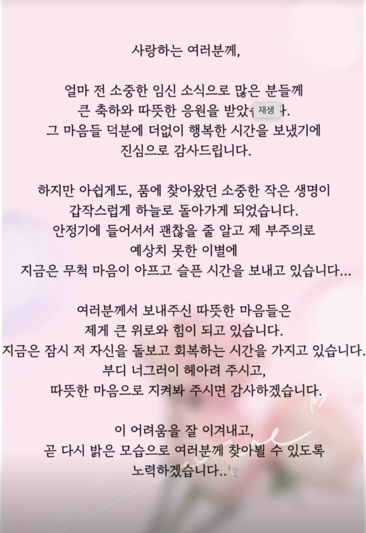 그는 “하지만 아쉽게도, 품에 찾아왔던 소중한 작은 생명이 갑작스럽게 하늘로 돌아가게 됐다”며 “안정기에 들어서서 괜찮을 줄 알고 제 부주의로 예상치 못한 이별에 지금은 무척 마음이 아프고 슬픈 시간을 보내고 있다”고 밝혔다.