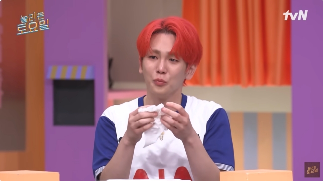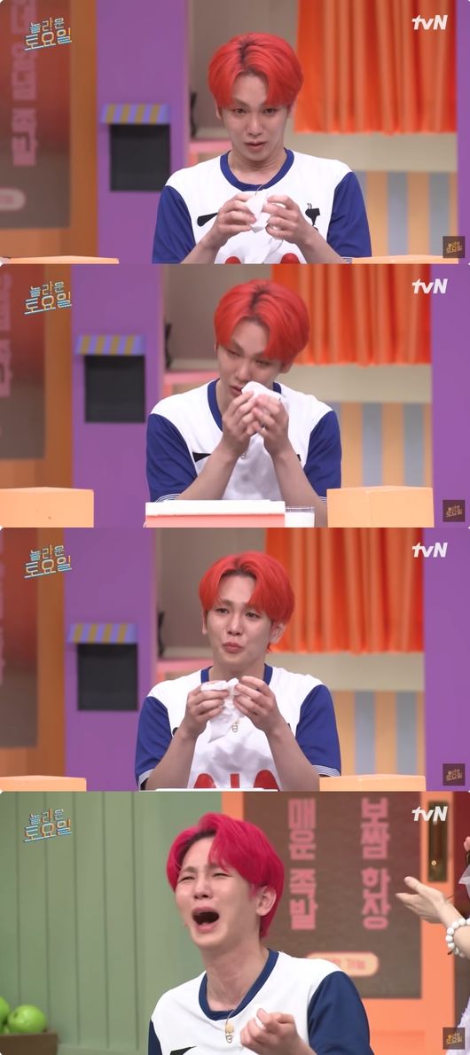 공개된 영상에서 키는 간식 게임 코너를 진행하던 중 갑자기 눈물을 터트렸다. 먼저 문제를 맞힌 키는 간식을 먹으면서 휴대전화를 확인했고, 이내 손으로 입을 막으면서 화들짝 놀랐다. 이에 옆에 앉아 있던 태연도 “깜짝이야”라며 함께 놀랐다.