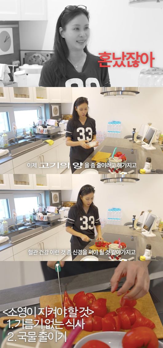 고기 양을 줄이라는 의사의 말에 고소영은 “포만감을 주기 위해 항상 계란을 4알 정도”라며 삶은 계란에 들기름을 부었다. 이어 “지금 나 운동하고 왔다. 방금 그래서 들기름에다가 계란 해서 한 알씩 먹을 거다”라며 토마토 주스도 함께 만들었다.