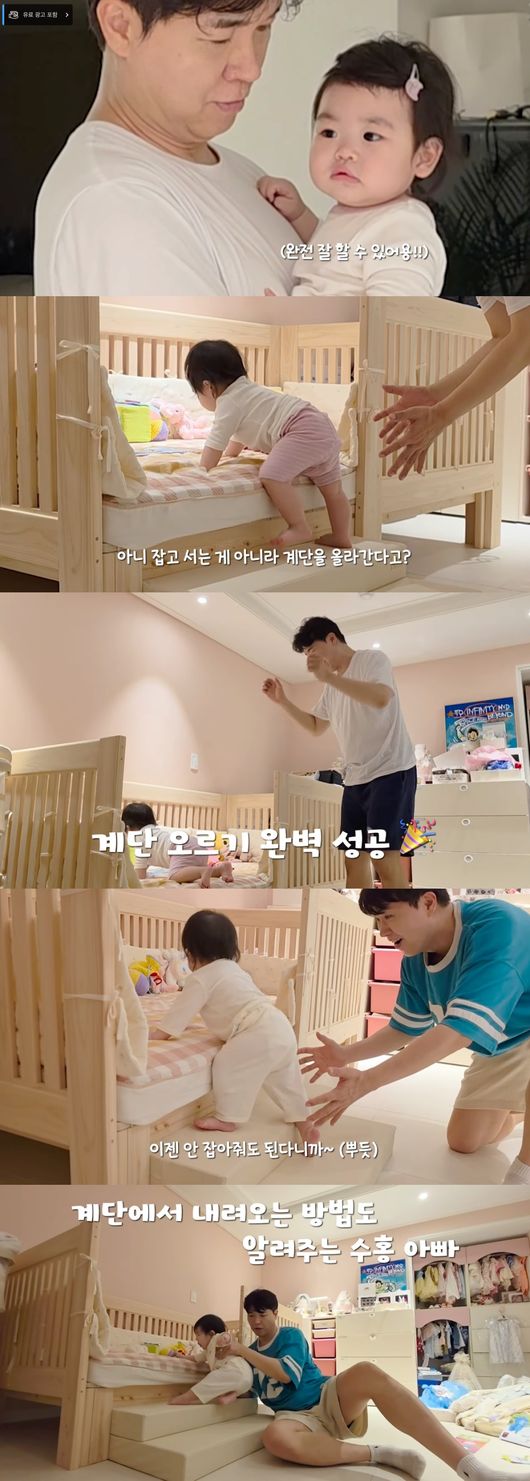 부쩍 자란 딸의 모습에 기쁨 만큼 걱정도 늘었다. 김다예는 "이제 한눈을 못 판다. 0.1초 사이에 사고 나겠다"라고 말했다. 이에 박수홍은 엉덩이를 내밀며 뒤로 침대 계단을 내려오는 방법을 알려주며 딸을 보호하려 해 훈훈함을 더했다.