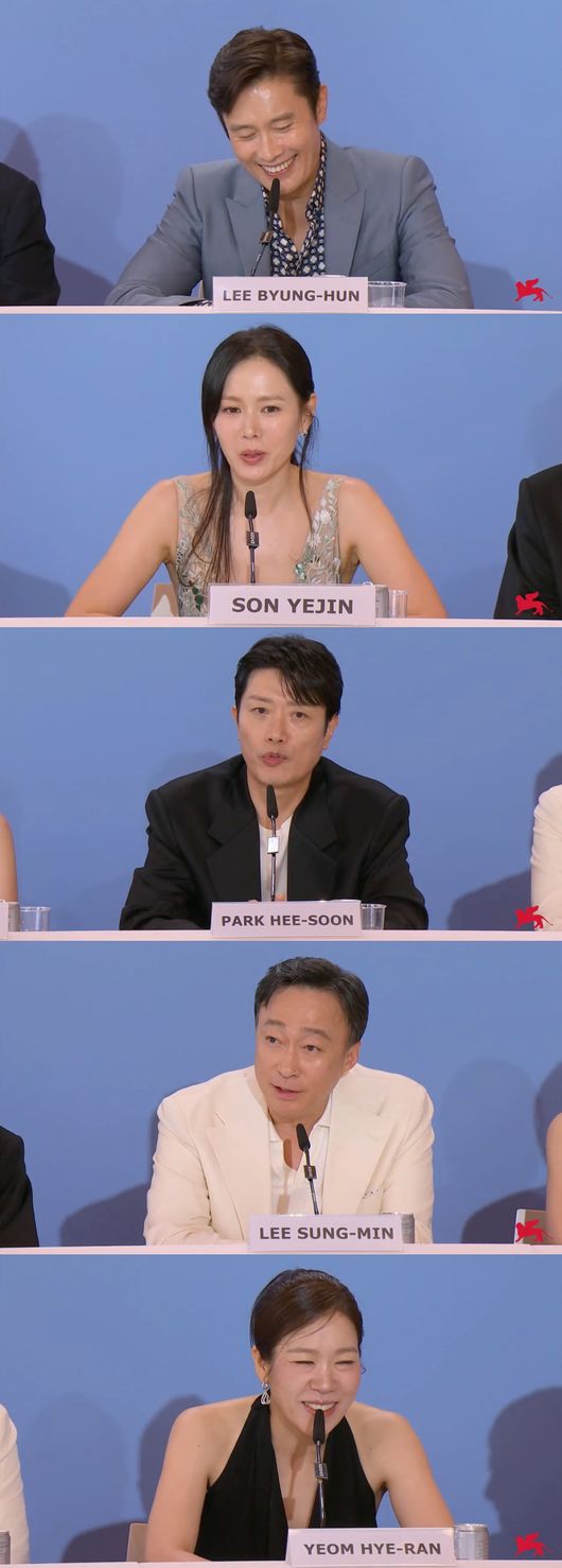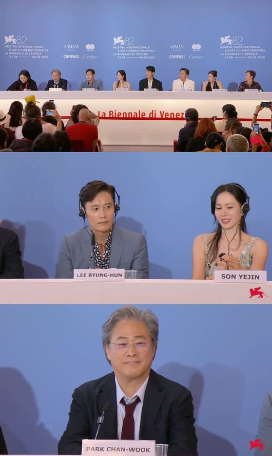 29일(현지시간) 이탈리아 베네치아 리도섬의 팔라초 델 카지노에서 제82회 베니스영화제 공식 기자회견이 진행됐다. 이 자리에는 영화 '어쩔수가없다'로 경쟁 부문에 진출한 박찬욱 감독과 작품의 주연 배우 이병헌, 손예진, 박희순, 이성민, 염혜란 또한 참석해 외신들의 질문에 답하며 작품에 대해 이야기를 나눴다.