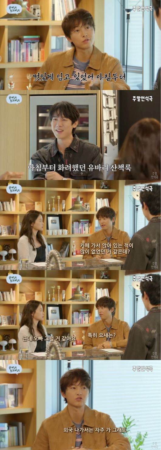 이날 유연석은 “중기는 동네에서 산책하다가 만났다”라고 말문을 열었다. 송중기는 유연석과 만났을 당시를 회상하며 “나는 트레이닝복에 머리도 못 감고 모자 쓰고 나왔는데 형은 멋있게 입고 입었다. 아침부터"라고 설명했다.