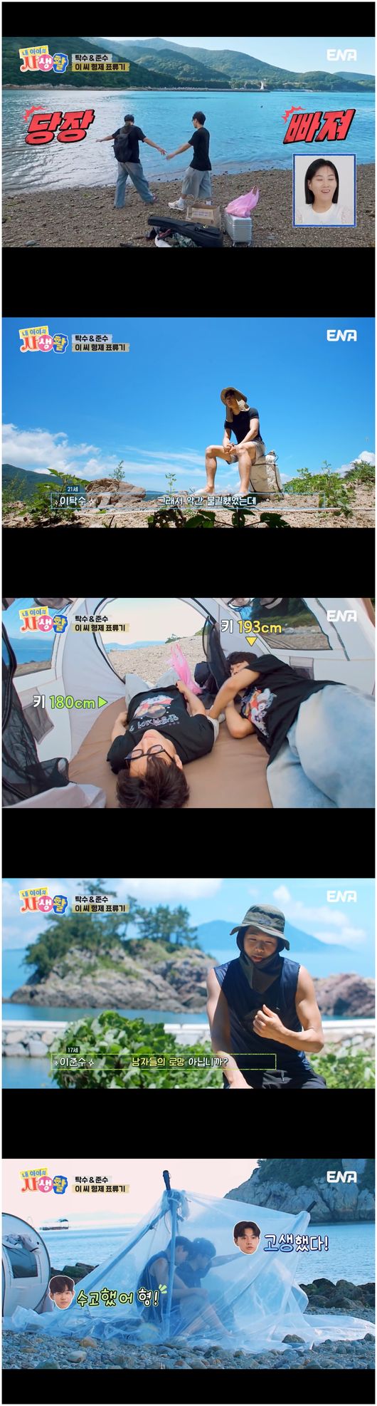 이들은 배를 타고, 또 타고 들어가 무인도에 도착했다. 아무것도 없는 해변에 내린 이탁수는 멍한 표정을 지었다. 이준수는 “여기가 우리 리조트야”라면서 "앞에 바다가 있으니 풀빌라 아니냐"라며 너스레를 떨었다. 이탁수는 “장난 치지 마. 여기서 텐트치고 여기서 잔다고? 잘 때 어떻게 하게. 모기에 다 뜯기게?”라며 경악했다.