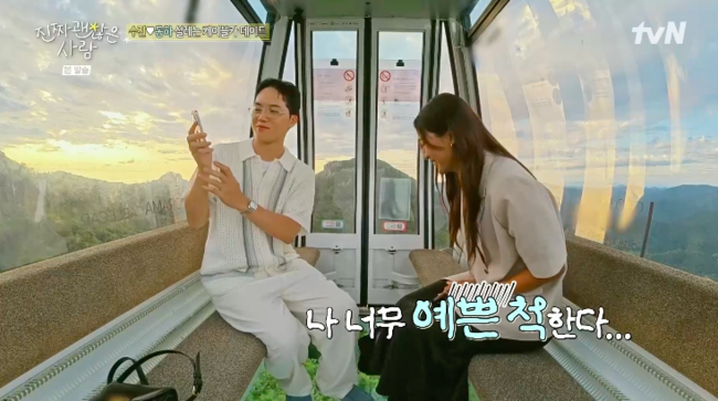 이날 강수진과 신동하는 케이블카를 타고 하늘에서 달달한 둘만의 시간을 보냈다. 커플 사진은 물론, 서로를 찍어주기도 했고 강수진은 “나 너무 예쁜 척 한다. 오그라들어”라고 말했다. 이에 신동하는 “예쁘잖아”라며 자연스레 칭찬했다.