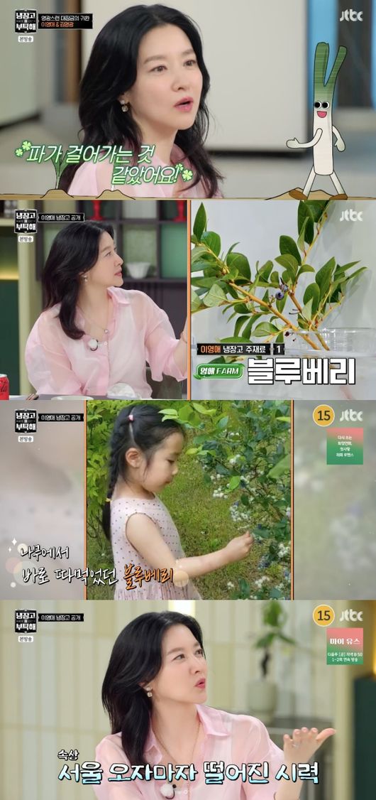 드디어 이영애의 냉장고가 공개됐다. 먼저 작은 냉장고에는 블루베리 나무가 있었다. 이영애는 “열매 뿐만 아니라 잎사귀가 가을이 되면 붉은색으로 변한다. 열매보다 영양소가 많다고 하더라. 잎사귀를 찻잎으로 우려먹는다”라며 “아이들이 양평에 살 땐 나무에서 바로 블루베리를 따먹었다”라고 설명했다.