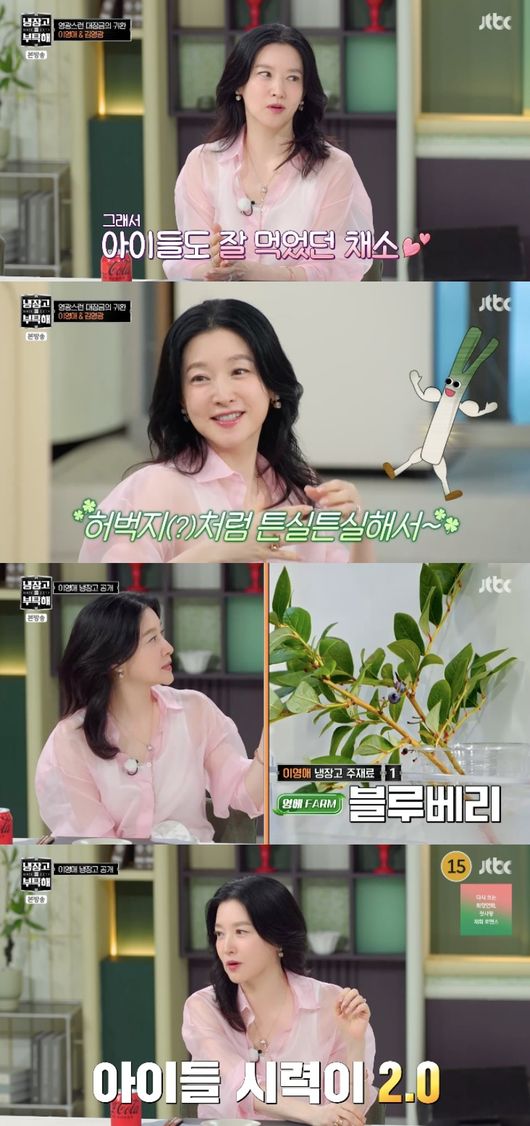 이영애의 냉장고는 2대였다. 먼저 작은 냉장고에는 블루베리가 나무가 있었고, 이영애는 “열매 뿐만 아니라 잎사귀가 가을이 되면 붉은색으로 변한다. 열매보다 영양소가 많다고 하더라. 잎사귀를 찻잎으로 우려먹는다”라며 “아이들이 양평에 살 땐 나무에서 바로 블루베리를 따먹었다”라고 이야기했다.