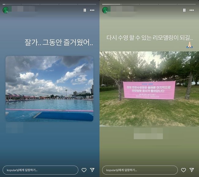 고경표는 지난달 31일 자신의 소셜 계정에 "잘가.. 그동안 즐거웠어.."라는 씁쓸한 글과 함께 서울시 공식 계정을 태그했다. 그는 잠원 한강 수영장이 리모델링 후 더 이상 성인들을 위한 공간이 아니게 될 것이라는 소문을 듣고 속상한 마음을 감추지 못했다.
