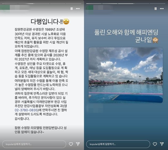 그러나 고경표의 공개 저격은 오해에서 비롯된 해프닝이었다. 고경표는 자신의 SNS에 한 시민이 보내준 서울시의 공식 답변을 공유하며 직접 사태를 수습했다. 서울시 답변에는 "잠원한강공원 수영장 재조성 공사설계를 추진 중에 있으며 수영장은 성인을 주요타겟으로 수영, 휴게, 포토존, 태닝 등을 도입할 계획"이라는 내용이 담겨 있었다.