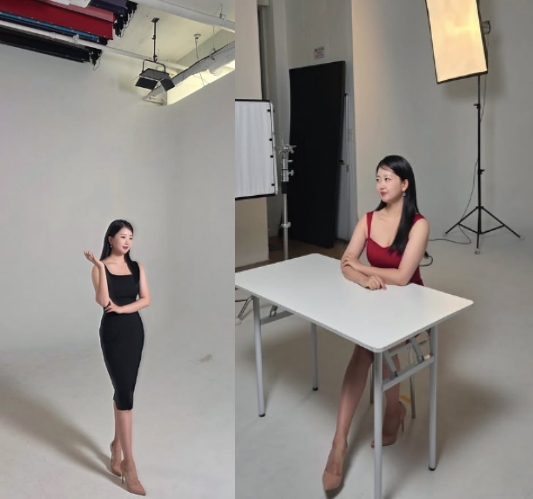 공개된 사진 속 김다예는 한 스튜디오에서 광고를 촬영 중인 듯한 모습이다. 김다예는 새빨간 원피스부터 검은색 원피스 등을 입으며 색다른 매력을 발산 중이다.