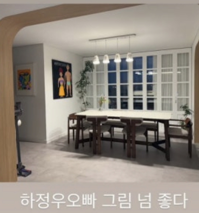 깔끔하면서도 세련된 인테리어가 돋보이는 공간 중에서도 시선을 끈 건 주방에 걸린 특별한 그림이었다. 바로 배우 하정우가 직접 그려 선물한 작품. 앞서 김지민은 ‘조선의 사랑꾼’ MC들을 초대한 집들이 자리에서 이 그림을 공개해 화제를 모았다.