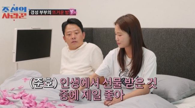 한편 침대가 곧 도착한다는 소식에 들킬까 초조했지만, 김지민의 깜짝 이벤트는 간발의 차이로 김준호에게 들키지 않았다. 침대 설치가 완료되자 김지민은 럭셔리 호텔에서나 볼 법한 수건 백조와 꽃잎으로 데커레이션까지 완벽하게 마치며 서프라이즈 준비를 마쳤다. 모든 준비가 끝나자 때마침 김준호가 돌아왔다. 서프라이즈 선물을 빨리 보여주고 싶었던 김지민은 “중고 거래할 거 또 찾았다”며 자연스럽게 김준호를 방으로 유인했다. 방문을 연 김준호는 침대를 보자 배시시 웃으며 김지민을 쳐다봤고 벽치기로 애정을 표현했다. 이어 김지민은 두 번째 선물인 TV까지 선사했다. 이를 본 김준호는 “인생에서 선물 받은 것 중에 제일 좋아”라며 김지민과 함께 새 침대에 누웠다. 결국 김지민과 김준호는 “좀 나가주실래요?”라며 제작진을 쫓아내, 꽁냥꽁냥한 시간을 예고했다. 앞서 두 사람은 자연임신을 원한다고 알려진 바다.