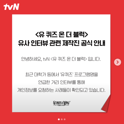 2일 tvN ‘유 퀴즈 온 더 블럭’ 측은 공식 SNS를 통해 “최근 대학가 등에서 ‘유퀴즈’ 프로그램명을 언급한 거리 인터뷰를 통해 개인정보를 요청하는 사례들이 확인되고 있다”고 전했다.