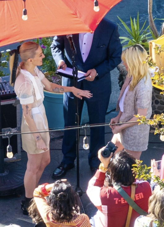 두 사람은 미국 LA의 트렌디한 실버 레이크 지역 멕시코 레스토랑 ‘카시타 델 캄포(Casita del Campo)’에서 가족과 지인들이 지켜보는 가운데 야외 다이닝 공간 파라솔 아래에서 서약을 나눴다. 장식은 화려함 대신 ‘Mrs.’가 적힌 머그컵 두 개로 꾸며 소박하면서도 특별한 분위기를 자아냈다.