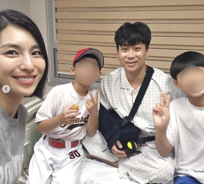 이와 함께 병원에서 환자복을 입은 채 배우 아내 김정화, 두 아들과 함께 찍은 가족사진, 의료진과의 사진도 공개해 눈길을 끌었다.