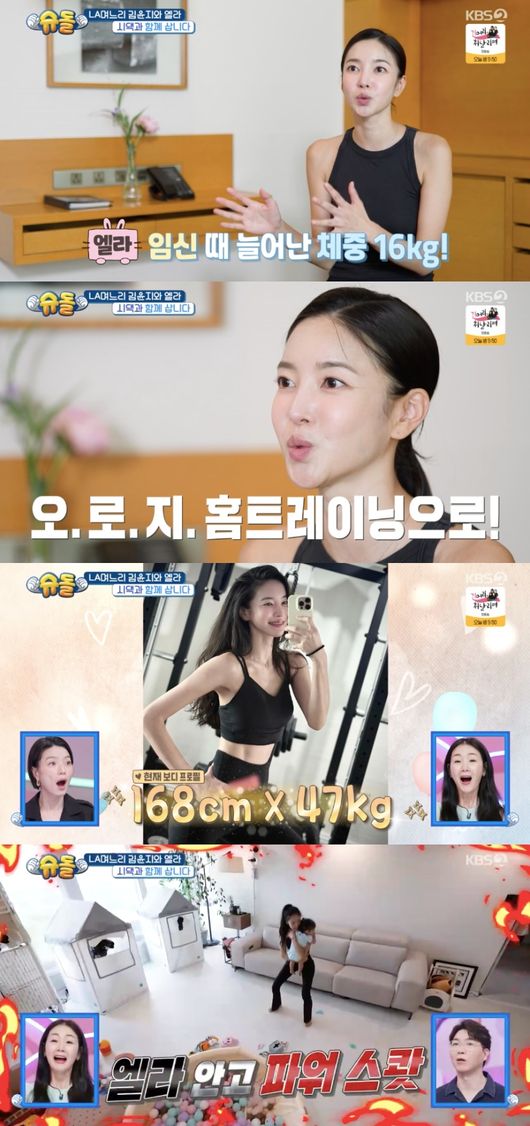 이날 김윤지는 딸 엘라와 함께 거실로 나와 운동을 시작했다. 아침부터 홈트 한다는 그는 “임신 때 16kg가 넘게 체중이 늘었는데 출산 후 홈트만으로 체중을 감량했다. 출산 전보다 몸무게가 빠졌다”라며 현재 166cm에 47kg라고 밝혀 놀라움을 안겼다.