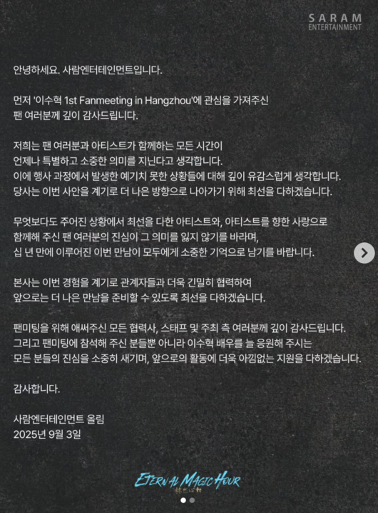 3일 이수혁의 소속사 사람엔터테인먼트 측은 공식 SNS를 통해 "먼저 ‘이수혁 1st Fanmeeting in Hangzhou’에 관심을 가져주신 팬 여러분께 깊이 감사드립니다"라며 공식 입장을 게재했다.