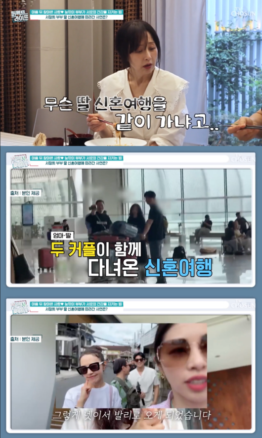 이에 서정희는 “사람들이 나보고 딸 신혼여행을 같이 가냐고 민폐 아니냐고 하더라. 나도 그렇게 하고 싶지 않았는데 사돈도 함께 가기로 계획했던 신혼여행인데 사돈이 사정상 못간다고 하니까 나도 갈까말까 고민했다”며 “사위가 계속 같이 가자고 하니까 우리도 신혼여행이지 않았냐”고 했다.