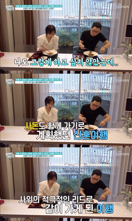 식사를 하던 중 남편 김태현이 “이번에 어떻게 하다가 동주 신혼여행에 쫓아가게 되가지고”라고 말문을 열었다.