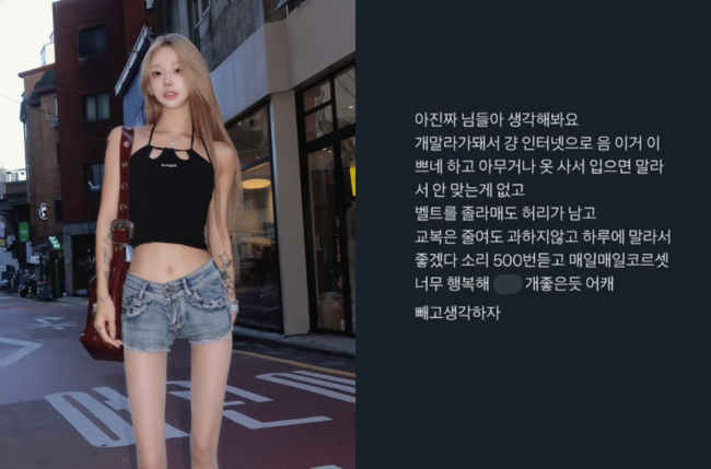 이어 "매일매일 코르셋 너무 행복해 개좋은듯"이라며 "빼고생각하자"라고 자신과 같은 다이어트를 적극 추천하는 모습을 보였다.