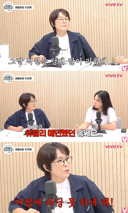 이어 그는 직원들에게 예민하게 굴었던 하루를 떠올렸다. 송은이는 “그날 아침 러닝으로 6km를 달리고 출근했다. 나는 괜찮다고 생각했는데 직원들이 담배를 엄청 피웠다더라”며 “그 정도로 예민했던 것 같다”고 고백했다. 실제로 직원들이 “은이 언니 아침에 러닝 못 하게 하자”라고까지 했다고.